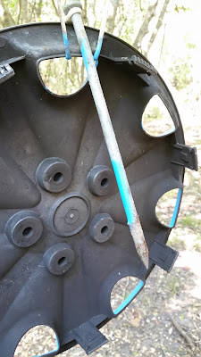 #11. and #12. These show the 6" galvanized nail attached to the cord at bucket #1. It is behind the blue painted hub cap. It has been adjusted to it's present position. I can tell by the paint on the nail that it's position has been moved since my last visit. The paint on the lower part of the nail could not have been accomplished at it's present position. When the hub cap was painted blue, the paint sprayed thru the hub cap openings and the nail was more horizontal.