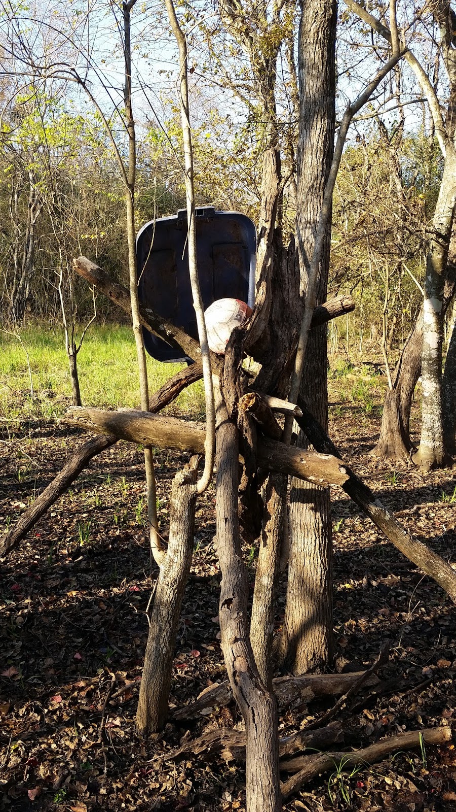 #16. My original set-up of limbs. I put the ball up onto the formation and added the plastic garbage can lid. As you can see, the ground is now somewhat dry. Typically, this ground is almost swampy after rains but not this trip.