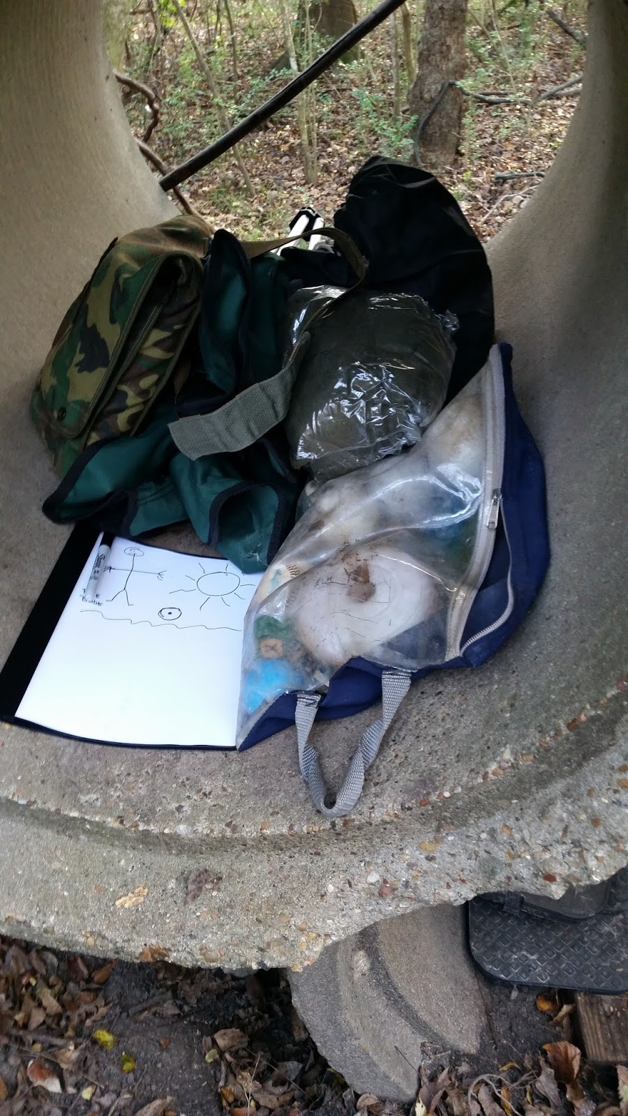 #27. thru #29. and #32.-----In the storage pipe, you can see the items I leave after a visit. I have a small folder with paper I've made designs on. The hope is that a marked response would appear. Also seen is the zippered map case. This is where the coin was removed from. Also this is where all the small set-up items are kept.